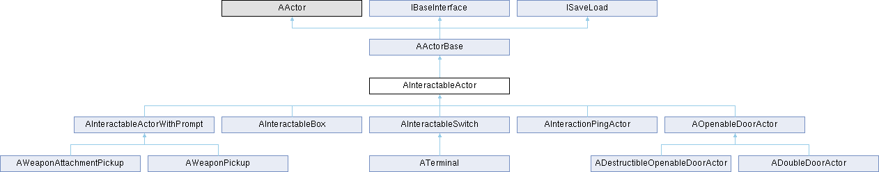Reimplemented in ADoubleDoorActor, AInteractableActorWithPrompt, AInteractableBox, AInteractableSwitch, AInteractionPingActor, AOpenableDoorActor, ATerminal, AWeaponAttachmentPickup, and AWeaponPickup.